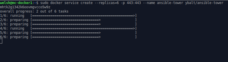 sudo docker service create --replicas=6 -p 443:443 --name ansible-tower ybalt/ansible-tower