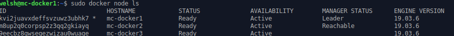 Looking on mc-docker1, we can see the state of the swarm if we execute docker node ls: