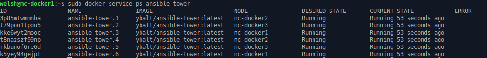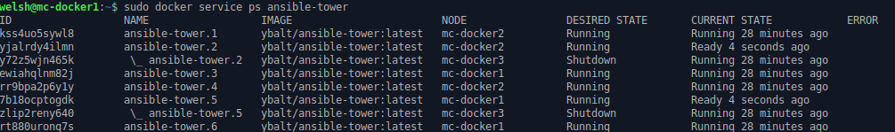 Running docker service ps ansible-tower from a Manager Node will confirm the distribution of Containers in the swarm: