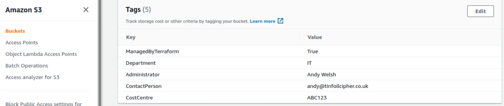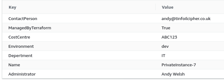 If we look at the AWS Console we can see that our tags have applied correctly upon running an apply: