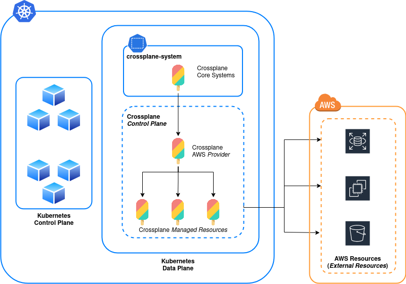 A final thing to be aware of; Kubernetes already operates it’s own Control Plane (known as the Master Nodes in old lingo). Don’t get this mixed up if you’re trying to do your own reading. Crossplane, along with anything it manages will be executed on the Kubernetes Data Plane the same as any other workload.