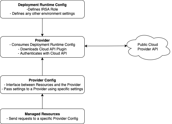 There are 3 main concepts to understand in how we should properly integrate with a public cloud using Crossplane: