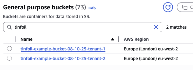 # tenant2 tinfoil-example-bucket-08-10-25-tenant-2 True True tinfoil-example-bucket-08-10-25-tenant-2 43s