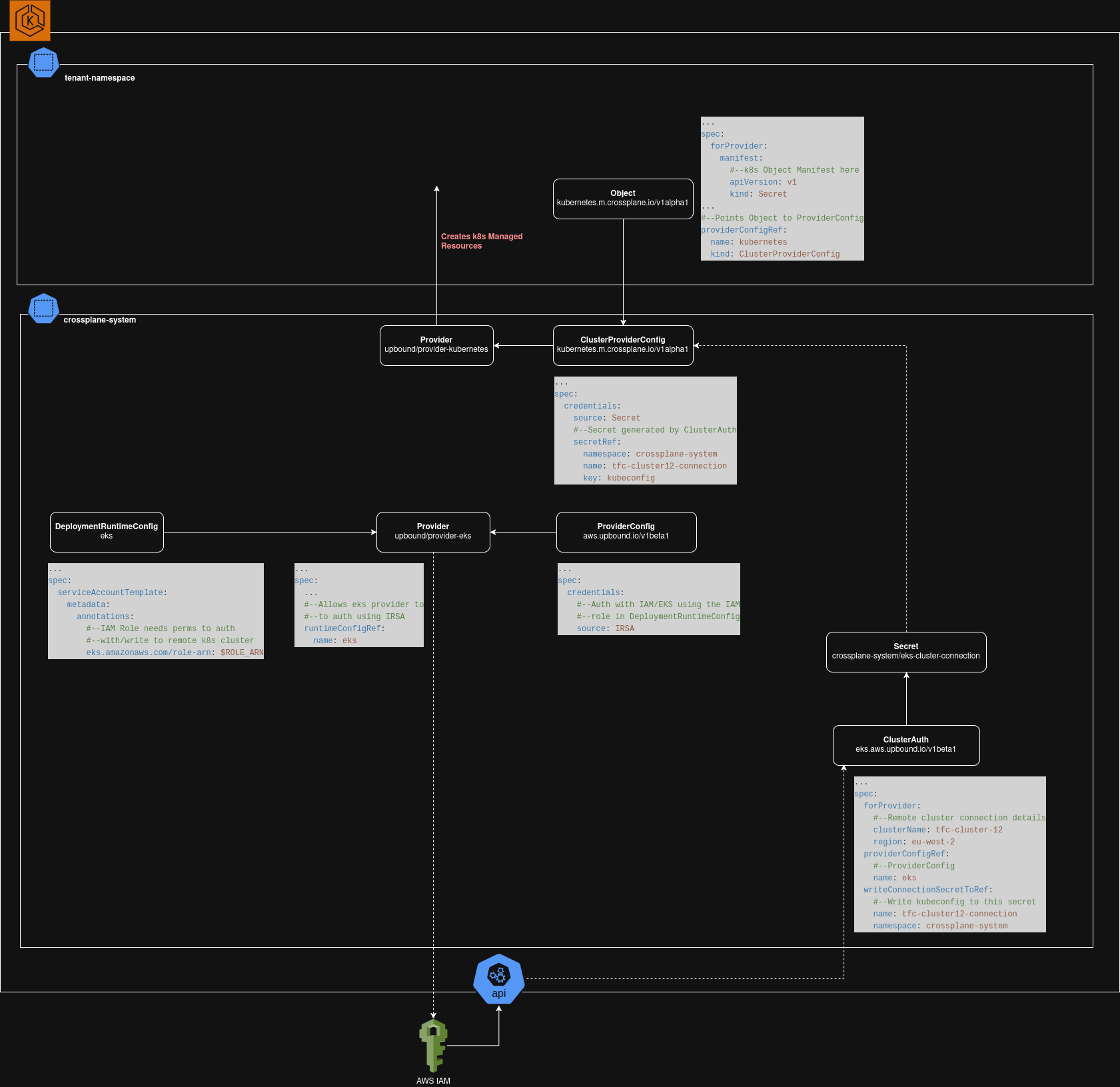 Authentication with EKS can be a bit of an involved process, from a high level, what we’ll need to do in Crossplane is:
