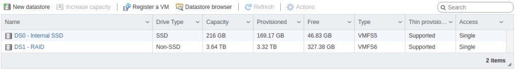 The hardware RAID was detected by VMware without issue, as was the internal SSD. This then allowed for the creation of two datastores, one on each volume: