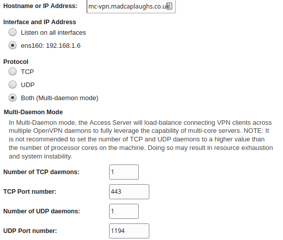 Unless you’re crazy or working behind multiple layers of security, you probably don’t want to display the admin page to the internet. Once you’ve logged in; browse to Configuration > Server Network Settings and set the protocol to run in Multi Daemon Mode (we won’t be using both TCP and UDP for VPN connections, UDP is more efficient for OpenVPN connections), TCP is going to be used for the web server), and the Hostname or IP Address should be set to the INTERNET FACING hostname/IP of the VPN. Since we’re going to be using TLS encryption for the web server, we’ll use TCP port 443 for the TCP daemon and the VPN will connect on UDP port 1194: