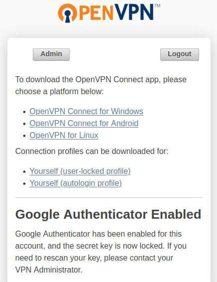 Once you log on you will be taken through the MFA enrollment process and taken to links to download the OpenVPN software (for whatever platforms you have allowed under Client Settings) as well as your configuration profiles: