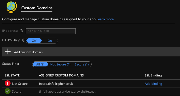 Going further in to Custom Domains, we can see that our Custom URL has applied without issue, however it is not TLS secured, being Microsoft we have to provide this in a .pfx format, will cover this in a later post, obviously you never want this in a production system and the generation of a certificate bundle should really be handled as part of a deployment pipeline.