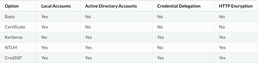 There are 5 ways to perform WinRM authentication with Windows nodes using Ansible, offering varying trade offs, at a high level they are: