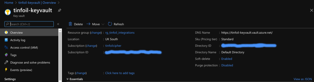Ahead of time, I’ve got my Key Vault in Azure named tinfoil-keyvault and have granted appropriate permissions for an existing Service Principal to access the Key Vault and have pre-populated it with some secrets: