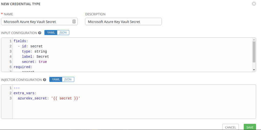Within Tower, we can browse to Credential Types and add a new YAML structure to define our new Credential, this will be used as a template for any credentials that we look up from our Key Vault: