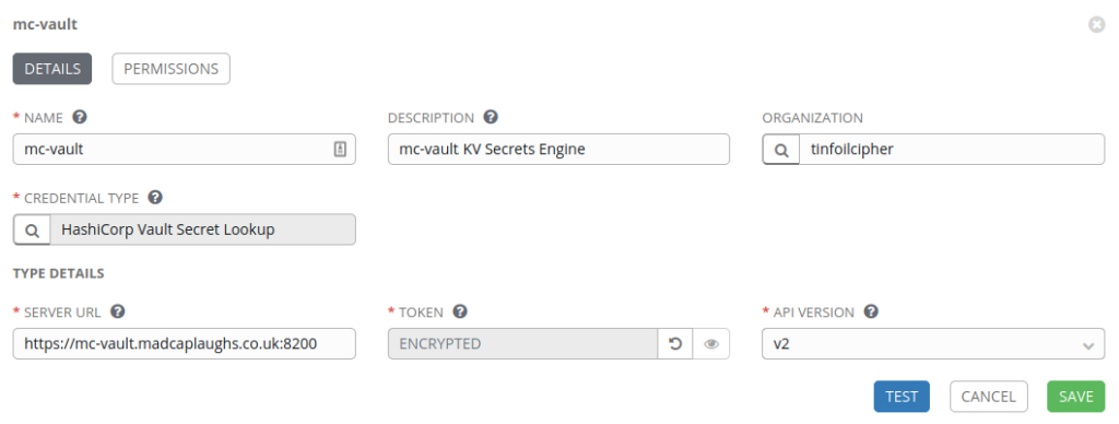 For the purposes of this post, we’ll be using the KV (Key Value) Secrets Engine (one of two supported with Ansible Tower, the other being Signed SSH) and accessing the Vault mc-vault.madcaplaughs.co.uk over TCP port 8200 using HTTPS.