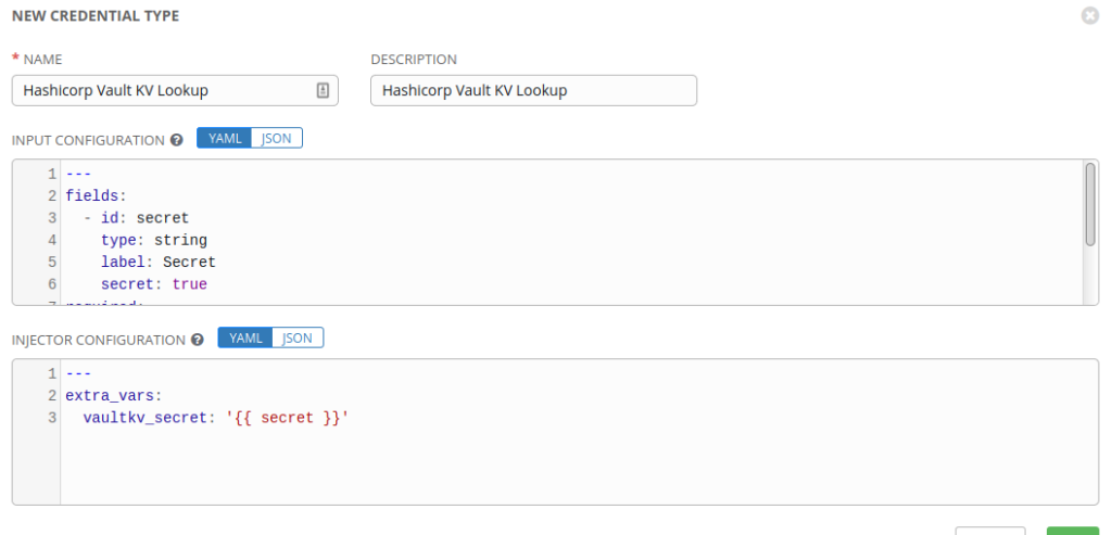 Within Tower, we can browse to Credential Types and add a new YAML structure to define our new Credential, this will be used as a template for any credentials that we look up from this Vault: