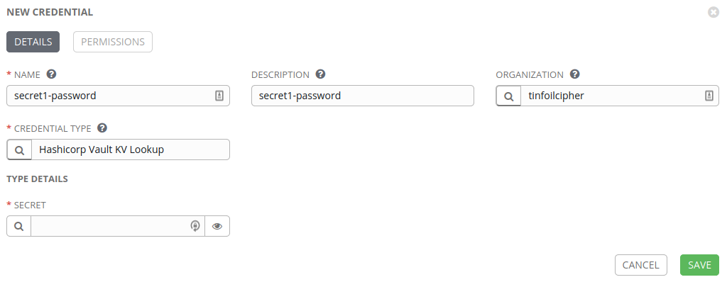 Now that we have this means of looking up individual secrets, we still need to load them in to Tower so that they can be assigned to Templates. In this example, I’m going to look up a Secret named secret1 and obtain it’s secret data held in a key named password for use in Tower Templates: