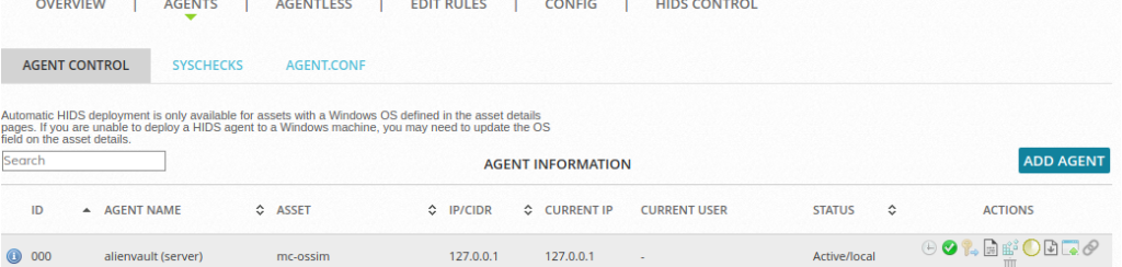 Within the OSSIM web console, browse to Environment > Detection > Agents where we should see only a single host (for the local host):