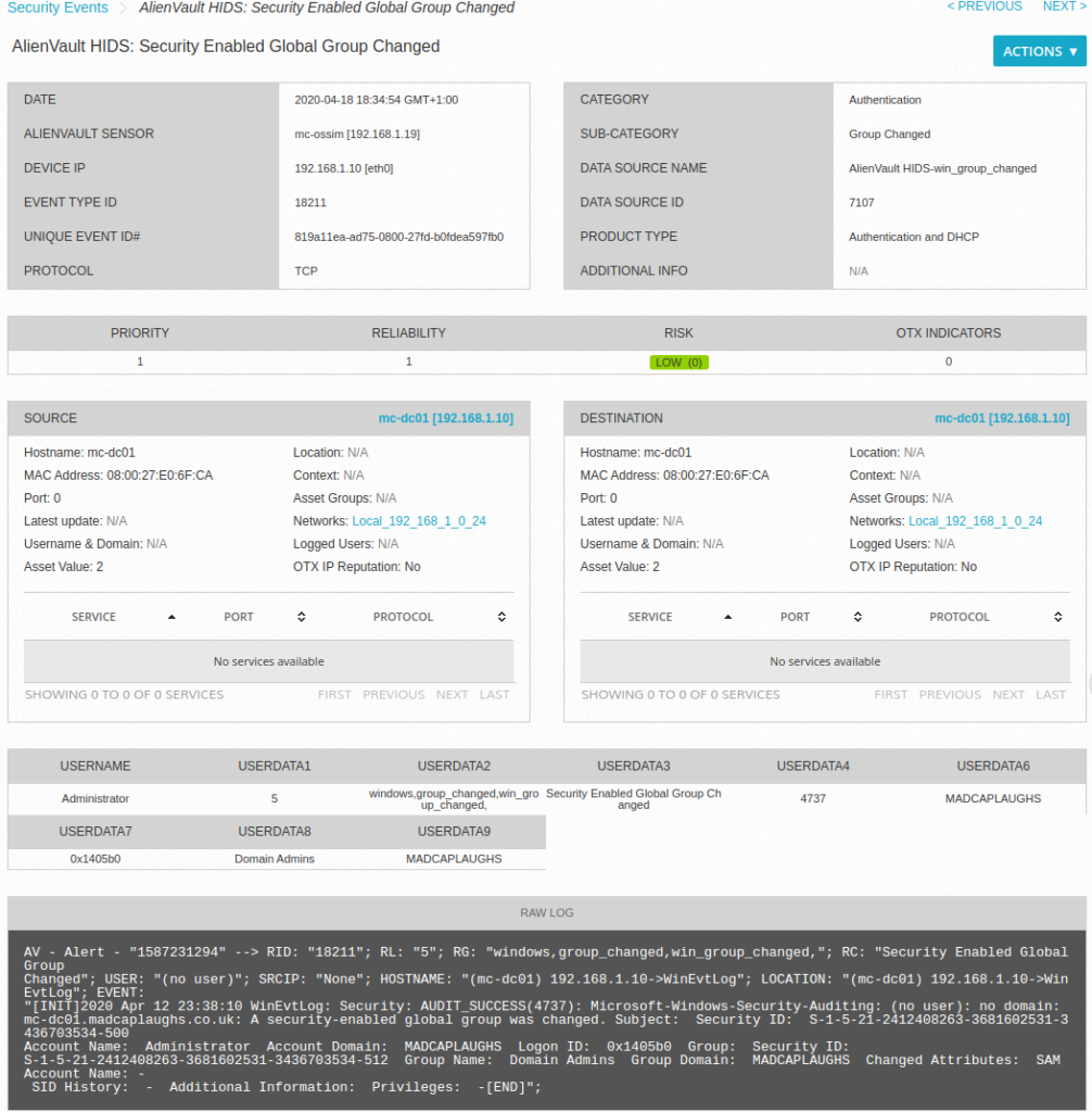 If we click on the IP we can drill further and see that events are indeed being recorded from the Windows Event Logs for the Domain Controller: