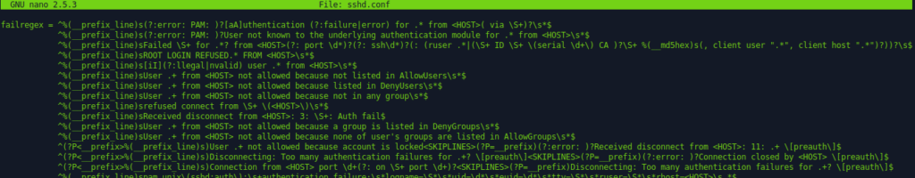 With this set we have hardened our servers SSH implementation, what’s going on under the hood is that the fail2ban service is going to look through the logs for SSHD authentication events and pattern match them using a series of Regular Expressions which pertain to failures, upon 5 of these events matching the same source, an event will be met which places the source in _jail, below is an example of the SSH regex: