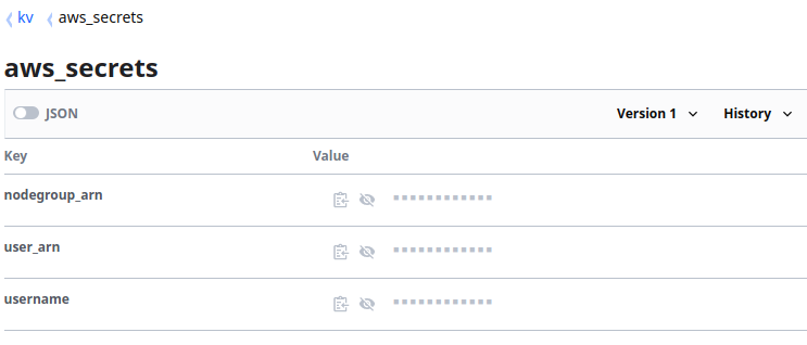 In Vault we have a kv type Secrets Engine named kv and a Secret in there name aws_secrets, this secret contains 3 Key Value Pairs named nodegroup_arn, user_arn and username, not great for production use but perfect for our example: