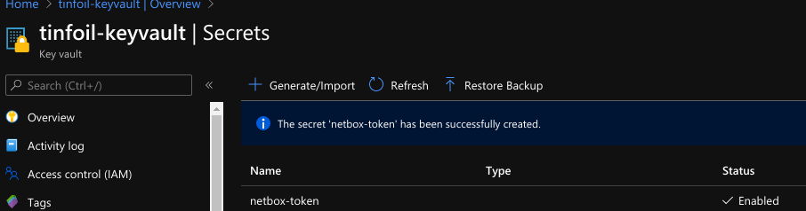 - This Vault has a single contains a single secret for the purposes of an example, the Secret contains an API token which we’ll use to access another platform (in this case Netbox)
