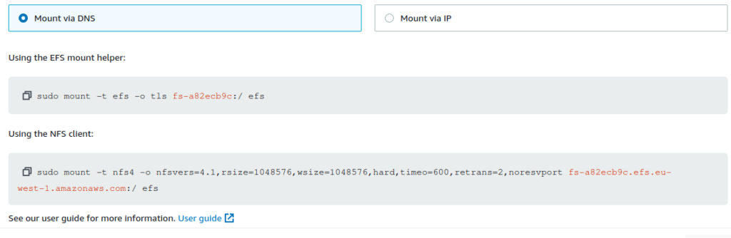 On our EC2 instances, we’ll be installing the nfs-common package and using standard mounting as we’re using Ubuntu Linux (the mount helper requires the amazon-efs-utils package which is available but needs to be built for Ubuntu), we’ll also be creating a mount point at /etc/efs. From here we can finally mount the share:
