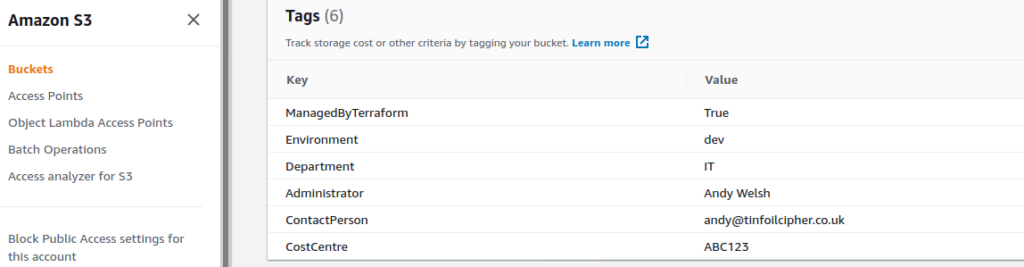 If we look at the AWS Console we can see that our tags have applied correctly upon running an apply: