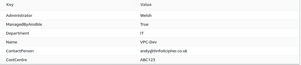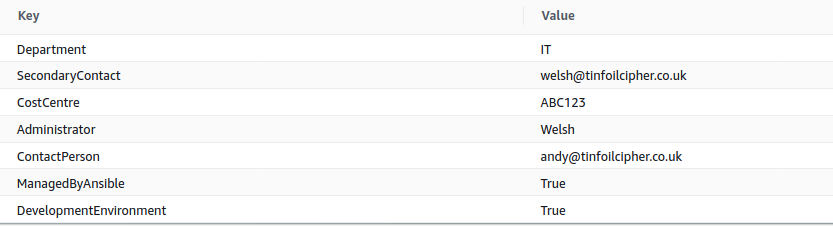 We’ll be working with AWS in these examples, though the same logic also applies to GCP and Azure and applies to the vast majority of resources which can be provisioned on all platforms as they all accept tags in a Key: Value pair format. AWS does however present an oddity with Ansible in terms of handling tags after provisioning in that tags can be manipulated without modifying their resource (see the AWS EC2 Tag module for an example).