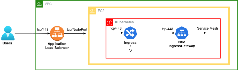 In the above example NodePort represents the specific TCP port number of the Istio IngressGateway’s traffic-port, which will forward traffic to TCP port 443 on the IngressGateway Service.