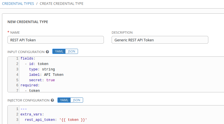 Custom Credentials allow us to create a custom set of inputs, optionally obscured at input and then remap them for use in a Task, this allows our same Credential Type to be re-used for any number of Credentials. Think of Credential Types as a template for Credentials that Tower knows nothing about yet.