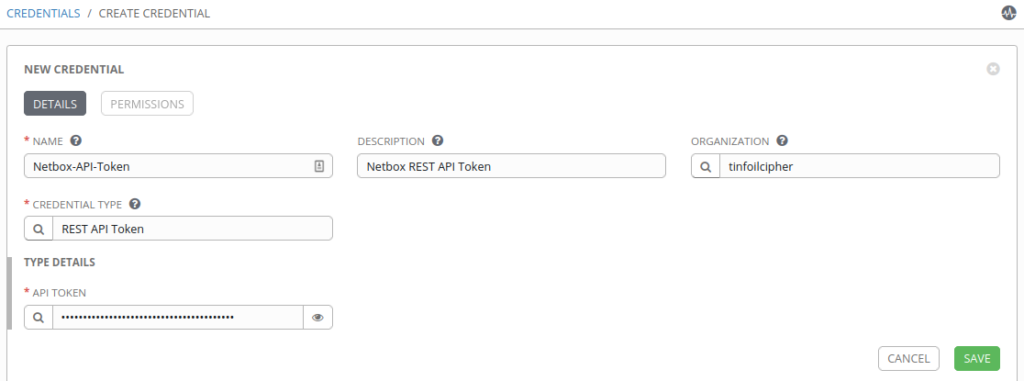 Now that we have a Credential Type defined, let’s create a Credential to leverage it. In Tower we can browse to Credentials and create a new Credential (in this example I’m going to create an API Token to communicate with my Netbox deployment):