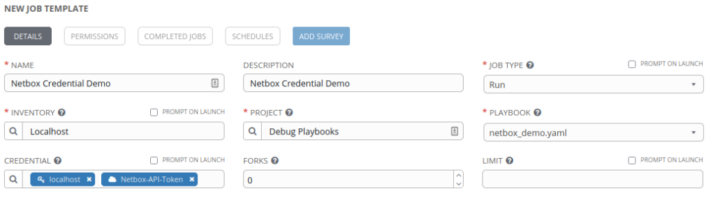 …and call the Playbook from a Template in Tower. Provided that we attach our new Netbox-API-Token Credential to the Template, we can implicitly call the new ”{{ rest_api_token }}” variable from within our Task: