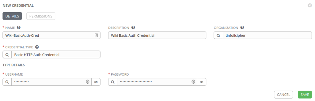 …and now when we try to create a new Credential using this Credential Type, we will be required to enter two secret values which will be implicitly available in our Playbooks as ”{{ http_basic_username }}” and ”{{ http_basic_password }}”.