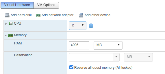 If you are running on a host with a very limited amount of RAM (like I am) you can squeeze out some more memory still. VMware happily supports Memory Overcommitment but things could go wrong fast under load, so when building our Workers we need to ensure that they are set to Reserve all guest memory on the host, ensuring that they will always have access to the full 4GB at all times: