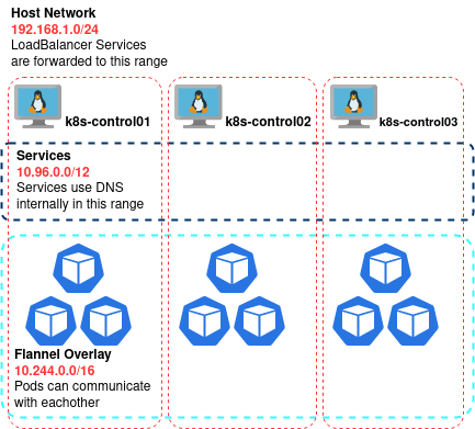 It is important to be sure that both of these ranges can provide a large DHCP pool which will not easily exhaust and will not clash with anything on the host network. To make our lives easier, we will be using the defaults for both the Service Range (as used by kubeadm) and our Overlay:
