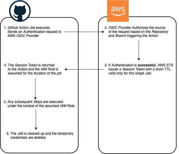 - A Trust Relationship between the two, which allows access only from a specific Github Organisation or Repositories with a strict TTL (Time To Live)