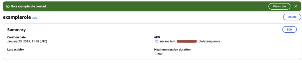 Our new role is now ready for consumption via Github Actions. By default it has a TTL of 1 Hour (meaning that any sessions we initiate via Github Actions have a 1 hour limit). Really this should be more than enough time, but it can be raised or lowered as needed under Maximum Session Duration:
