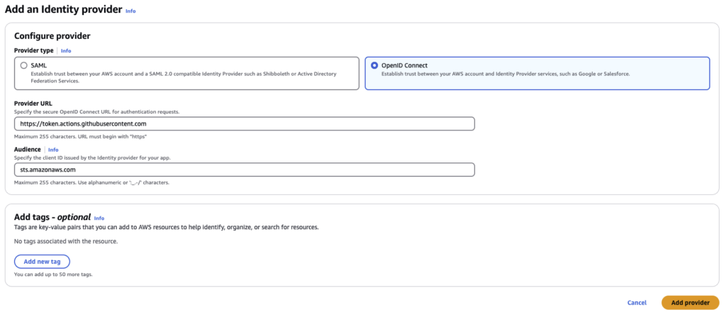 - Provider URL: https:token.actions.githubusercontents.com - This will ensure that OIDC Authentication requests are accepted ONLY from Github Actions Jobs and not from rogue sources
