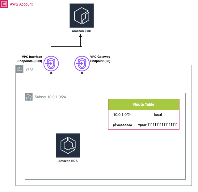 Understanding how traffic moves around inside a VPC is useful here. Since our ECS Cluster is isolated within one or more private subnets, with no routes to go anywhere beyond it’s own address space and our ECR Repository is only accessible via a public IP address the problem is pretty obvious; our subnet is really a little bit too private. We will need to introduce some method to get access to ECR that isn’t via the public internet.
